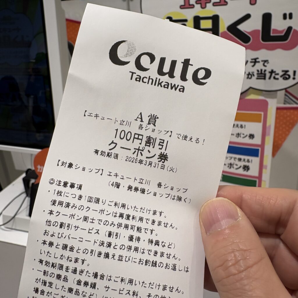A賞:エキュート立川各ショップで使える「100円割引クーポン券」